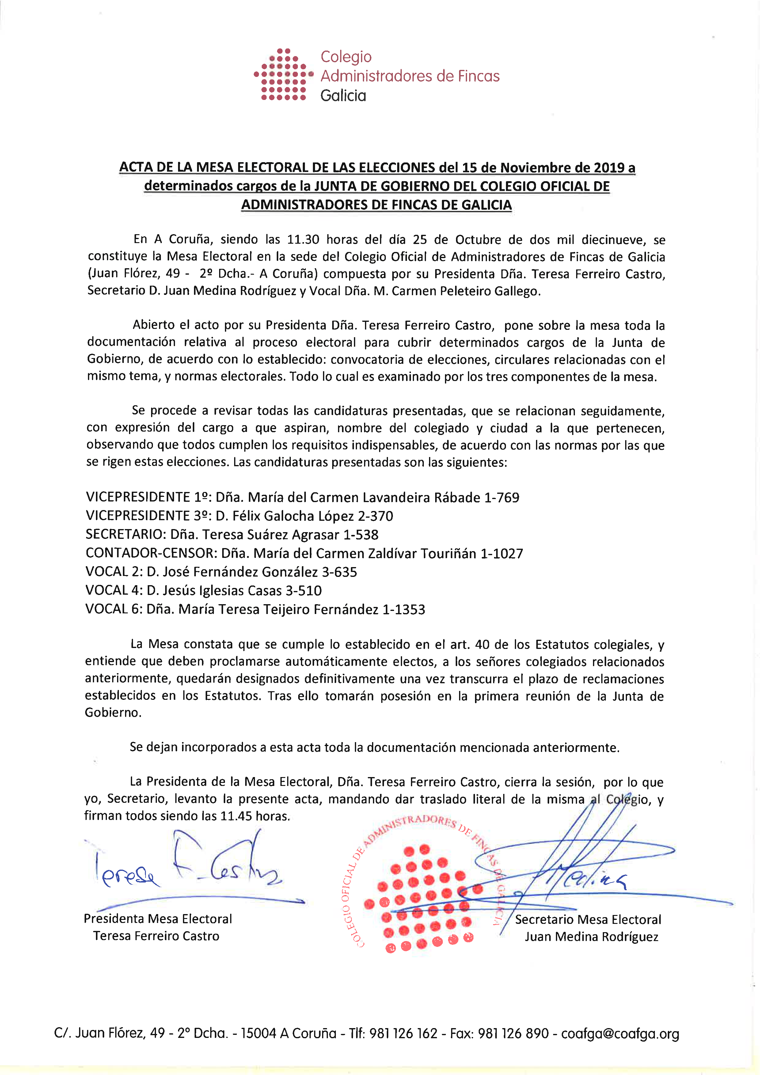 ACTA MESA ELECTORAL - PROCLAMACIÓN CANDIDATOS ELECTOS