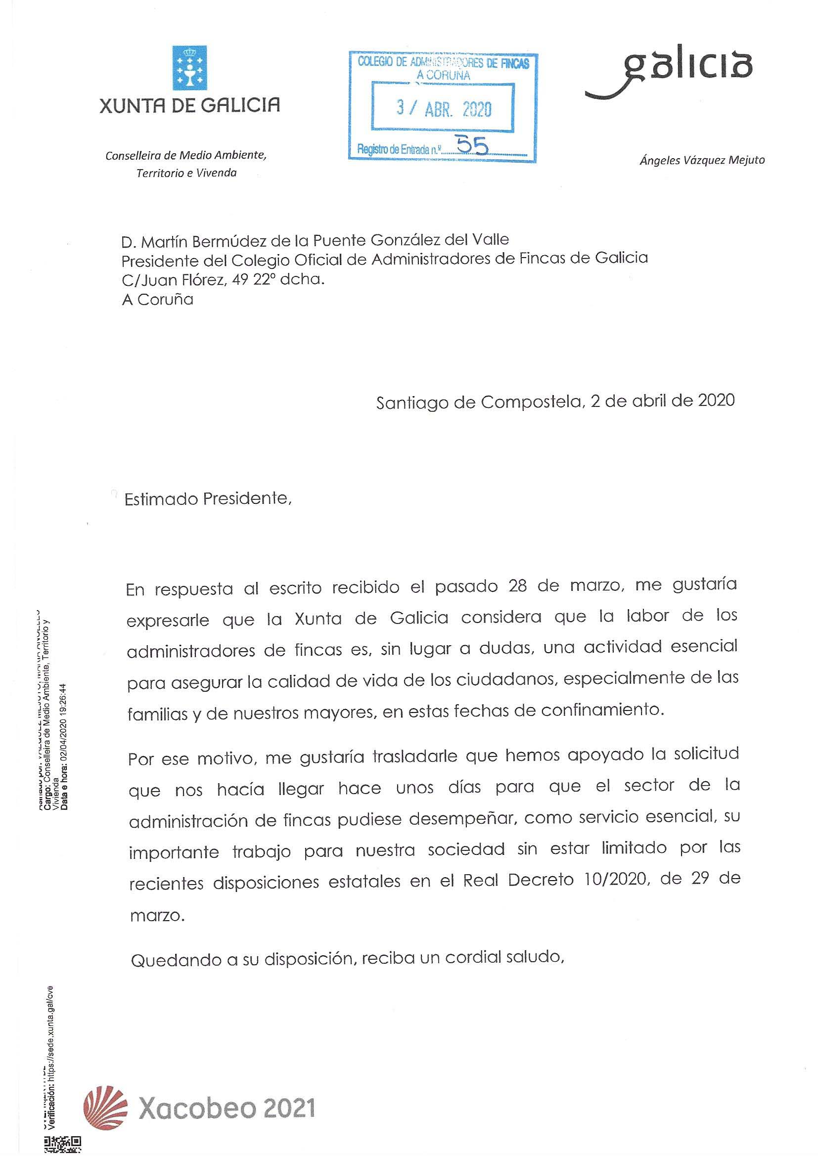 La Xunta de Galicia apoya a los administradores de fincas como actividad esencial para garantizar la calidad de vida de los ciudadanos durante el periodo de confinamiento